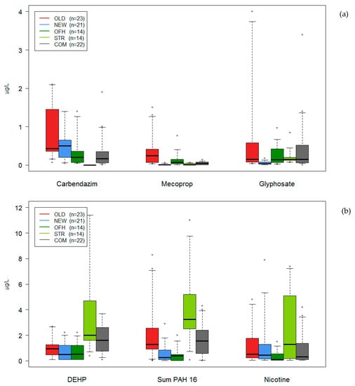 Concentration boxplots of selected biocides/pesticides (a) and DEHP, PAH and nicotine (b) by catchment type (OLD—old building areas, NEW—high-rise newer buildings, OFH—one-family houses, STR—streets >7500 vehicles/d, COM—commercial areas). Whiskers show 5%/95% quantiles.