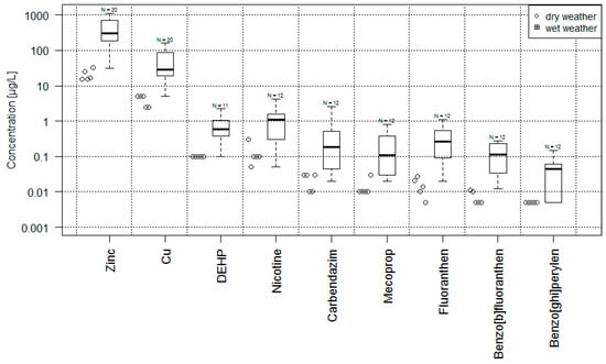 Concentrations of selected substances during storm events (boxplots) and dry weather (open circles) in the urban river Panke. Whiskers show minimal and maximal values.