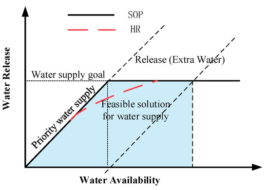 In Figure 1, SOP is the Standard Operation Policy, and the area enclosed by the HR line and the available water (X axis) are both feasible dispatch intervals. Therefore, the most critical issue of hedging regulation is the determination of the HR dispatch curve. Usually, the goal is to maximize the benefits of the current water supply and the remaining period (two-stage water supply, time scale model). A variety of constraints are considered, and the objective function is established. It is also possible to consider multiple goals at the same time and solve them by a multi-objective algorithm, so as to obtain the final hedging rules for actual scheduling.