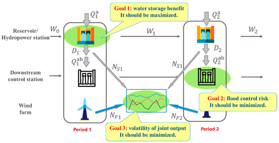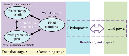 In order to ensure the safety of flood control during the flood season, the hydropower station is dispatched according to the flood limit water level. The utilization rate of water resources in this dispatching method is low. During the flood season, the joint dispatch of hydropower and wind power should not only consider the water storage benefits of hydropower stations, the flood control risks of hydropower stations, and upstream and downstream, but also ensure the peak-regulation and power generation requirements of the joint system. Therefore, joint dispatching is a typical multi-objective hedging problem. In terms of time, there is a conflicting relationship between the water storage benefit goal in the current period and the flood control risk goal in the future period. In terms of space, there is also a competitive relationship between the current water storage benefit goal of hydropower stations and the benefit goal of joint hydropower and wind power dispatch.