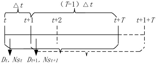 In the real-time joint dispatching, according to the forecasted water inflow and wind power output in each period, the hydropower and wind power joint dispatching plan for the current period is worked out by weighing the benefits of reservoir storage for profit, flood control risk, joint output volatility, etc. Then, according to the updated water inflow, wind power output, and other information, the dispatching plan for the latest period is re-formulated. It can be seen that real-time scheduling is a process of rolling forward the forecast and decision-making period by period based on the forecast information of the facing period and remaining period (foresight period). Therefore, the process of the joint dispatch of hydropower and wind power in the flood season can be regarded as a two-stage dispatch problem, which is divided into the decision-making stage and the remaining stage. As shown in Figure 3, stage 1 is the decision period including a scheduling period , and the remaining period of stage 2 includes periods . The real-time scheduling model keeps rolling forward with time, and the decisions in the decision-making period also keep rolling forward and updating. is the water discharge in each period, and is hydropower output in each period.