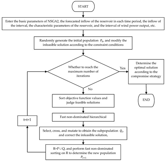 The dispatch of hydropower and wind power based on the hedging theory is a multi-objective problem, which can be solved by the non-dominated sorting genetic algorithm (NSGA2) [37]. The dispatching model of hydropower and wind power based on the hedging theory can adjust the parameters to be optimized based on the simulation of the dispatch process in each period, and solve the optimal parameters in the dispatch process, that is, the water storage capacity and wind power output in each period. Firstly, a set of optimal parameters is randomly generated in the feasible region. According to the forecast information, the current period of water storage benefit, the joint dispatch output, and the remaining period of flood control risk in the full calculation period are simulated and calculated, and the three optimized objective function values of the model are obtained. The statistical objective function values are fed back to the optimization algorithm, and the fast non-dominant sorting and crowding calculation are realized in the optimization algorithm. Then, one must use the optimization algorithm to cross-mutate the optimal parameters, and then select the appropriate individual to evolve to generate a new parent population, and finally enter the simulation module to re-simulate. One must follow the above steps to iterate until the requirements are met. The specific process is shown in Figure 5.