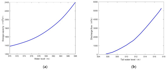 (a) Water level-storage capacity curve; (b) Discharge flow-water level curve.