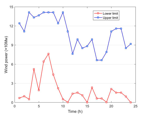 - Wind power output constraintwhere: is the output of the wind power station in the period , (kW); is the lower limit of wind power output in this period, (kW); is the upper limit of wind power output in this period, (kW); that is, the output of wind power cannot exceed the maximum power generation capacity of the wind power station.