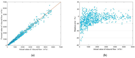 (a) Relationship between actual inbound flow and forecasted flow; (b) Relationship between actual inbound flow and relative error.