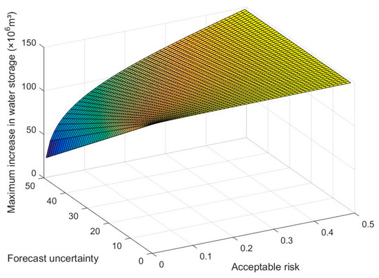 According to the downstream flood control risk determination method proposed in Ref [32], the relationship among the factors is shown in Figure 9. It can be seen that when the forecast uncertainty level increases or the acceptable risk decreases, the maximum allowable downstream storage capacity will decrease. According to the forecast model established in this paper, under the current forecasting level, the forecast error analyzed above obeys the normal distribution . When the downstream flood control acceptable risk is 0.006, the maximum increasable water storage capacity can be obtained as 63.0 × 106 m3, and the corresponding reservoir water level is 583.90 m. The water storage level of the hydropower station is 588 m, which corresponds to a total storage capacity of 2400 × 106 m3.