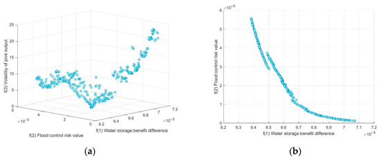 Figure 10 shows the Pareto optimal frontiers of multi-objective optimization. Among them, Figure 10a is the Pareto optimal frontier for the three goals of water storage benefit, flood control risk, and joint output volatility, and Figure 10b is the Pareto optimal frontier between the water storage benefit and flood control risk in Figure 10a. It can be seen from Figure 10b that there is a contradictory hedging relationship between the flood control risk value and the water storage benefit difference. When the water storage capacity increases, the difference in water storage benefits will decrease, but the flood control risk value will increase accordingly. However, due to the existence of the benefit goal of joint output, there is an overlap in the figure. At the same time, it can be seen from Figure 10a that the regulating capacity of hydropower stations will also be affected, which will affect the volatility of the joint dispatch of hydropower and wind power. Therefore, there is a certain competitive relationship among the three goals of the differences in water storage benefit of hydropower stations, the risk value of flood control, and the volatility of joint dispatch: There is an inverse proportional relationship between the profit benefit difference goal and the flood control risk goal of the reservoir, and the joint output volatility goal shows a trend of first decreasing and then increasing with the increase of the water storage benefit. When the water storage is large and the water discharge is small, the hydropower output value is small, and the regulation ability of wind power is reduced. When the water storage is small and the water discharge is large, in order to ensure that the amount of water discarded is small or not, the regulation ability of hydropower to wind power will also be affected. Table 2 presents the three sets of solutions with the best water storage benefit, the best flood control risk, and the best joint output volatility, as well as the most satisfactory solution selected according to the multi-objective compromise strategy.