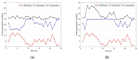 Comparison of joint dispatching results. (a) Joint dispatch of hydropower and wind power based on hedging theory; (b) Conventional hydropower and wind power joint dispatch.