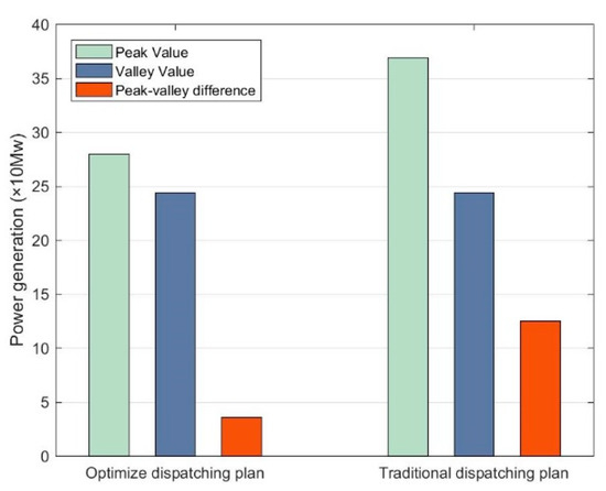 Figure 12 is a comparison diagram of the peak-to-valley difference between the optimized dispatching scheme and the joint output of the traditional scheme. It can be seen from the figure that the adoption of the multi-objective optimization dispatching scheme makes the peak-to-valley difference of wind power and hydropower combined output 35.66 MW, while the peak-valley difference of the conventional scheme is 125.00 MW. The optimal dispatching model enables part of the incoming water to be used for planned power generation, and the other part of the incoming water is stored in the reservoir under the conditions of flood prevention and safety, which increases the adjustment space of the hydropower station. Therefore, the curve is more stable and less volatile, which has a positive significance for wind power consumption.