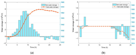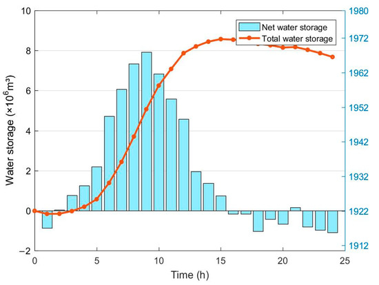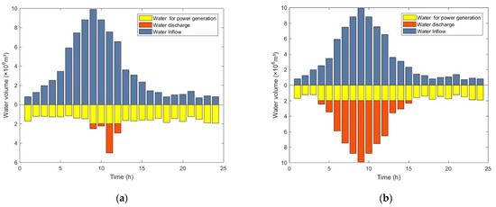 Figure 13 and Figure 14 show the comparison of inflow, discharge, net storage, and total reservoir storage between the hydropower and wind power joint dispatch based on hedging theory and conventional dispatch. Figure 13b shows the changes in the storage capacity of the conventional reservoir operation. In order to ensure the safety of flood control during the flood season, the storage capacity of the reservoir is guaranteed to be below the storage capacity (1922 × 106 m3) corresponding to the flood limit water level (583 m). When the water storage is less than 1922 × 106 m3, or the incoming water volume is less than the power generation water volume, the water volume beyond the completion of the power generation plan can be stored in the reservoir, as shown in Figure 13b for period 1–period 3. When the water storage reaches 1922 × 106 m3, the reservoir must safely discharge the excess storage, as shown in Figure 13b during the period 4–15. Additionally, in order to prevent water abandonment, the hydropower station is generally full-load at this time, which is not conducive to the smooth output of wind power and hydropower joint output. After time period 16, when the inflow of the reservoir is less than the water consumption for power generation, the reservoir needs to use the storage capacity below the flood limit water level for power generation. The original dispatch plan made the water resources underutilized. In Figure 13a, the hydropower and wind power joint dispatch scheme based on hedging theory uses public storage capacity to pre-store the excess water in the reservoir during periods of large inflows. Additionally, when the inflow of water and the inflow of the downstream area suddenly increase, the excess water in the reservoir can be safely discharged. Then, the water level drops back to the flood limit water level, making full use of flood resources on the basis of ensuring the safety of reservoirs and downstream control stations.