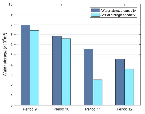In the hydropower and wind power joint dispatching scheme based on the hedging theory shown in Figure 14a, the hedging process of the flood control risk goal and the water storage benefit goal appears in the period 9–12. In order to ensure the safety of flood control during the whole time period, part of the water storage benefit was discarded in the period 9–12. Some of the remaining water that can be stored after power generation water is safely discharged, instead of storing all of it in the reservoir. At this time, although the benefit of water storage is weakened, the risk of flood control is also reduced. Figure 15 shows the comparison between the water storage and the actual water storage during the period 9–12. The figure shows the comparison between the optimal storage decision value based on the hedging theory and the actual storage. The actual storage capacity in time period 9 to time period 12 is less than the storage capacity in order to reduce the risk of flood control. Therefore, some water storage benefits must be reduced. At time period 11, because the water storage volume is already large at this time, the forecasted water volume for the next time period is also large. In order to ensure that the flood control risk during the entire dispatch period is as low as possible and the water storage benefit is as large as possible, the actual water storage capacity in period 11 is very small. It can be seen that hydropower stations reduce the benefits of water storage in some periods of time to minimize the risk of flood control, thereby ensuring the safety of flood control.