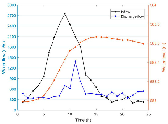 - Discharge flow of the reservoir constraintwhere: is the discharge flow of the reservoir during the period , ; is the minimum discharge flow, ; is the downstream safe discharge, .