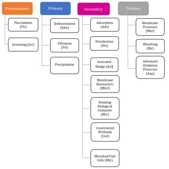 Typically, there are three main categories for WWT, as shown in Figure 1, namely: physical, biological, and chemical []. Due to this categorization, WWT is commonly performed in stages, namely: pretreatment, primary, secondary, and tertiary to effectively remove contaminants based on their physical, biological, and chemical properties [,]. The pretreatment stage typically consists of a screening unit to remove large solids such as rags, cans, bottles, or anything that could clog pumps or pipes downstream [,,,,]. Another conventional process at the pretreatment stage is the addition of flocculants, which helps suspended solid contaminants to coalesce together and form heavier solids within the WW stream. After the pretreatment stage, the water flows to the primary stage, where contaminants are generally removed using physical means. Sedimentation and filtration are conventional technologies used at the primary stage to remove solid contaminants. Most bacteria and microorganism treatment methods are found at the secondary stage. The secondary stage is typically used to remove biological contaminants. The tertiary stage is usually used to adjust the pH and remove further, contaminants that are still not within the desired standards [,]. Mostly, the primary stage involves physical treatment processes, while the secondary and tertiary stages include biological and chemical treatment processes.
