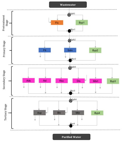 The first stage in the superstructure is the pretreatment stage, which is made up of a flocculation (Flc) unit. The second stage is made up of primary treatment technologies, specifically, granular filtration (Ftt), and sedimentation (Sdm). Adsorption (Ads), activated sludge (Asl), rotating biological contactors (Rbc), membrane bioreactor (Mbrt), and disinfection (Dis) are the technologies for the secondary stage. The tertiary stage is made up of advanced oxidation processes (Aop), bleaching (Blc), and membrane processes (Mbr). Depending on the optimization, the optimal path may or may not include a stage. The bypass (Byp) stream allows for that option. Figure 3 shows the overall superstructure for WWT. Each stage of the treatment process is linked to the next stage by mixers (Mxr) and splitters (Splt).