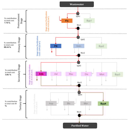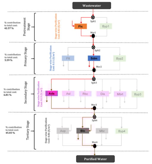 Optimal path selected for municipal WWT through GAMS. Flocculation (Flc), sedimentation (Sdm), adsorption (Ads), and bleaching (Blc) are the selected technologies. The tertiary stage contributes a percentage of 45.03% to the total cost, followed by the pretreatment, secondary, and primary stages, respectively.