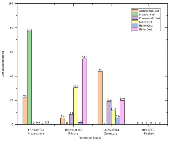 The total cost of treatment is made up of capital and operating costs. The capital cost was annualized over a plant life of 30 years using a capital recovery factor of 0.11. The operating cost constitutes five categories: materials, labor, utilities, consumables, and other costs. Material cost includes the purchase cost of ozone, flocculants, and sodium hypochlorite added in respective technologies. Labor cost is based on a 330-day working period per year at a rate of USD 30 per hour. Utilities are made up primarily of the power required by each treatment technology. Consumable cost constitutes the cost of membranes for technologies that require membrane and granulated activated carbon (GAC) for the adsorption technology. The other cost is made up of overhead costs for project management.