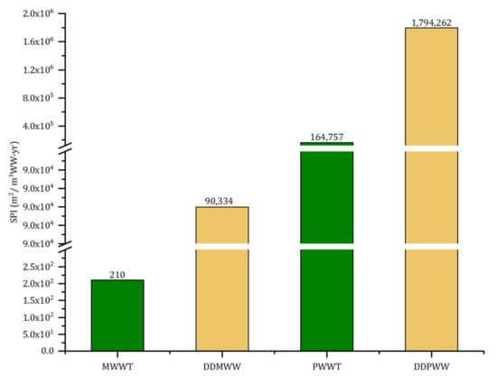An alternative to LCA for quantifying the sustainability of WWTNs is the sustainable process index (SPI). The SPI, developed by Narodoslawsky and Krotscheck [], is an ecological footprint that quantifies the area needed to provide goods and services. The core of the SPI evaluation is the calculations of the area needed to embed a process entirely into the biosphere []. It has been widely applied in the measurement of ecological performance in production systems []. SPI uses material and energy balances for evaluation purposes. It describes the relevant ecological pressures of a process, including the supply chain, product usage, and disposal. There are seven footprints, quantified by area, which are calculated using the SPI methodology. These footprints are the area needed for raw material production, the area needed for the energy production, the area needed for installation of equipment, the area needed for staff, and the area needed for embedding water, soil, and air emissions sustainably into the ecosystem. The sum of these partial areas gives the total arable area needed for that process. There are other sustainability assessment methodologies and the work by Singh et al [] provides an in-depth analysis of these various methodologies.