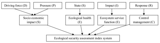 Currently, model evaluation methods are used in ecological security assessment, and the most commonly used evaluation models include the PSR model, DSR model, and DPSIR model []. In 1979, Rapport and Friend proposed a model framework for analyzing and describing the interaction between socioeconomic development and the ecological environment, which was further improved by the Organization for Economic Co-operation and Development and United Nations Environment Programme, forming the PSR model framework []. The basic connotation of the PSR model is that human activities exert pressure on the environment and its natural resources (P-pressure), which changes the state of both the environment and the quality of the natural resources (S-state), forcing human society to respond to these state changes through adoption of policies, decisions, or management measures that affect the environment, economy, and land (R-response) []. The PSR model is suitable for ecological security evaluation on a small spatial scale and with few influencing factors. However, because it simplifies the causal relationship between indicators, it ignores the complexity of the system, especially the driving force factors of ecological security []. To overcome this weakness, the United Nations Conference on Sustainable Development established the DSR framework in 1996, in which the driving force factors (D) refer to the regional socioeconomic objectives which represent the fundamental environmental pressure. The DSR model can better characterize the impact of the driving force factors on ecosystem evolution, but the definitions of the driving force factors and the response factors in the model were vague. Therefore, to improve the applicability of the DSR model, in 1999, the European Environment Agency officially adopted the DPSIR model (driving force–pressure–state–influence–response), in which influence refers to the impact of changes in environmental status on environmental receptors []. The model combines the characteristics of the PSR and DSR frameworks. It has the advantages of comprehensiveness, systematicness, and flexibility, and covers five assessment factors and constructs a causal network between them to reflect the impact of socioeconomic development and human activities on the system state and the human response to adverse impacts [].