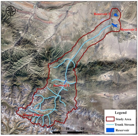 In addition to the main stream, the study area includes one main glacier and three reservoirs (Figure 2). The main glacier, which is the source of the river, presently covers an area of 1.62 km2. Taking this glacier as the center, 109 large and small modern glaciers are developed within an area of 300 km2, comprising a total glacier area of 38.3 km2. Among them, 22 glaciers are distributed within the study area, covering a total area of 9.7 km2. The annual runoff of glacier meltwater into the trunk stream is 17.69 million m3. Therefore, glaciers are not only an important water source in the study area but they also represent a “solid reservoir” regulating runoff. Reservoir 1 (Figure 2) is located in the upper reaches of the study area. It is a water conservancy project that has flood control and irrigation as its primary and secondary purposes. Its operation is mainly divided into reservoir closure, dam flood control, and sluice water storage. The dam crest elevation is 2189.2 m, and the total storage capacity is 69.9 million m3. The highest dam height is 98 m. Reservoir 1 can exploit its flood-retention capability to cut the peak flood and regulate and store the flood during the flood season. Reservoir 2 (Figure 2) is located in a mountain depression of the middle reaches of the study area. It is a series regulating reservoir upstream of the urban area. It undertakes the three tasks of flood control, drought relief, and urban water supply for the city. The catchment area above the section of Reservoir 1 is 2596 km2, including 1070 km2 in the mountainous area of the main stream, 950 km2 in the piedmont plain area, and 576 km2 in the mountainous area of tributary gullies. Reservoir 3 (Figure 2) is located 6 km downstream of Reservoir 2. It is a through-injection reservoir built using natural depressions. The current water surface area is 4.5 km2 and the maximum storage capacity is 53 million m3. It is a large reservoir for comprehensive flood discharge irrigation, power generation, fish aquaculture, and urban water supply.