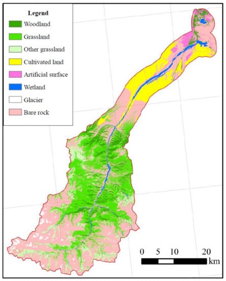 The soil distribution in the upper reaches of the study area has vertical zonation. In addition to ice and snow cover, at elevations above 3600 m, exposed rocks and stone mounds are widely distributed, although some areas have poorly developed soil. The soil in the elevation range of 3100–3400 m is mainly alpine meadow soil; 2000–3100 m is mainly subalpine meadow soil; 1700–2000 m is mountain chernozem; 1200–1700 m is mountain chestnut soil; and 800–1200 m is brown calcareous soil. The soil at 1700–2900 m has mosaic distribution characteristics. Taupe forest soil is mainly found on shady slopes at elevation of 1700–2900 m, and it is distributed in a compound area with chernozem and subalpine meadow soil. The climate and terrain in the watershed vary markedly, and the corresponding vegetation types are relatively complete with obvious regularity in terms of geographical distribution. The main vegetation types are coniferous forest, broadleaved forest, shrub, grassland, meadow, and desert grassland. We used ArcGIS 10.3 to interpret the land use of the study area in 2014, and the results showed that grassland was the main vegetation cover type, followed by woodland and cultivated land (Figure 3).