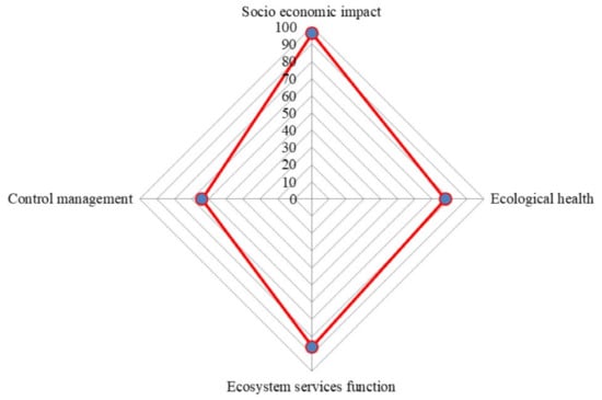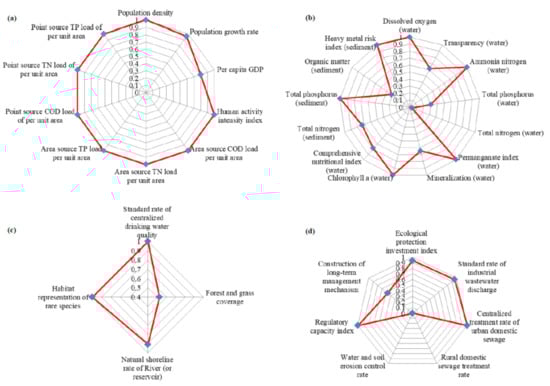 Radar diagrams for the four factors in the SEEC model: (a) socioeconomic impact assessment results, (b) ecological health assessment results, (c) ecological services function assessment results, and (d) control management assessment results.