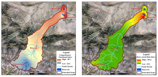 The score for E (ecological health) is about 78, indicating the negative role it has in ecological security. The score distribution of the 13 indicators is shown in Figure 6b. Among the 13 indicators, the value for the total nitrogen in the water is too high, followed by the comprehensive nutritional index, organic matter, and heavy metal risk index. In terms of the spatial distribution, the comprehensive nutritional index in the upstream area is relatively low, but it increases gradually from the midstream area to the downstream area, reaching its highest value near Reservoir 3, which mainly reflects the intensity of human activity and tourism development []. The heavy metal risk index in the upstream and midstream areas is low, while the highest value is near Reservoir 2. The evaluation results of the comprehensive nutritional index and heavy metal risk index are shown in Figure 7.
