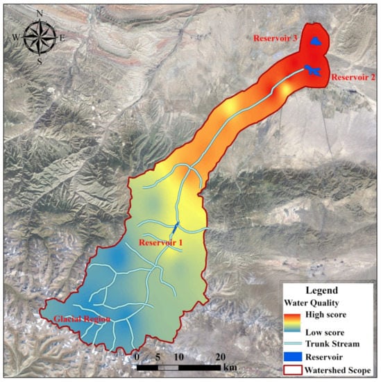 Then, ArcGIS 10.3 was used for spatial interpolation to obtain the spatial distribution characteristics of water quality, as shown in Figure 8. Finally, the Pearson correlation coefficient between the data illustrated in Figure 8 and the SEEC evaluation results (Figure 4) was calculated using the ArcGIS 10.3 spatial analysis module. Through calculation, the Pearson correlation coefficient was determined to be approximately −0.4, which was consistent with the rules described above, indicating that the comprehensive evaluation results of water quality were better in areas with high ecological security scores. The evaluation results showed that the SEEC model has satisfactory performance when applied to evaluation of watershed ecological security.