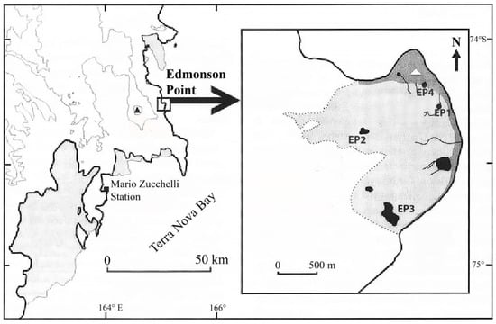 The sampling of surface water (n = 4) and sediment (20–25 cm depth; n = 4) was carried out at four lakes (EP1 to EP4) lying in the Edmonson Point area (Figure 1). Sampling activities were carried out in the morning.