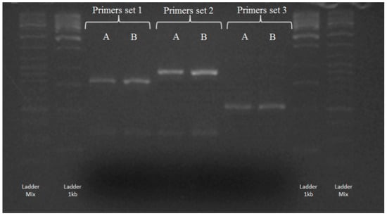The reaction mixtures for the primers set testing were assembled at 0 °C and contained 1 µL DNA, 1 µL of each of the two primers (10 μM), 0.4 µL of each dNTP (10 mM), 2 µL of reaction buffer 10X, 0.4 µL of BSA (2.5%), 0.4 µL of Taq polymerase 5 PRIME (5 U/µL), and sterile Milli-Q water to a final volume of 20 µL. Negative controls for DNA extraction and PCR setup (reaction mixture without a DNA template) were also used in every PCR run. DNA from B. xenovorans (DSM 17367) was used as a positive control. The PCR program was as follows: (1) 95 °C for 5′; (2) 35 cycles at 94 °C for 45″, 60 °C for primers set n. 1 and 3, instead 58 °C was used for the primer set n. 2 for 1′ and 72 °C for 2′; (3) 72 °C for 10′ []. For better separation of the amplified fragments, more stringent agarose gel electrophoresis (2%, w/v) conditions were applied. Amplification products were visualized in TAE buffer (0.04 M Tris-acetate, 0.02 M acetic acid, 0.001 M EDTA), containing 1 µg mL−1 of ethidium bromide, and the fragment size was evaluated through the use of a 1 kb ladder (Fermentas, Milan, Italy).