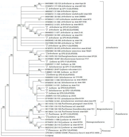 The affiliation of 37 (out of 57 strains) is reported in Table 4 and comparative sequence analysis indicated that most isolates were closely related to already known and/or previously isolated bacteria (16S rRNA similarity, ≥97%). The 16S rRNA gene sequencing of seven PCB-oxidizing isolates (i.e., EP2-10, EP1-11, EP2-11, EP2-14, EP3-26, EP3-30, and EP3-41; Table 4), all harboring the bphA gene, gave no amplification results. The phylogenetic tree in Figure 3 shows the clustering of some representative isolates (highlighted in bold in Table 4) from EP lakes. PCB-oxidizing bacterial isolates mainly belonged to the Actinobacteria (15 and 11 from water and sediment samples, respectively), followed by the Betaproteobacteria (four and five from water and sediment samples, respectively), Gammaproteobacteria (one Lysobacter isolate from EP4 sediment), Firmicutes (one Planococcus isolate from EP4 sediment). Actinobacteria were mainly represented by Salinibacterium (11 isolates; exclusively from water samples) and Arthrobacter (10 isolates; mainly from sediment samples) members. Proteobacteria, mainly affiliated to Betaproteobacteria class, were exclusively represented by Pusillimonas members (nine isolates).