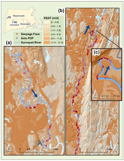 We compared soil parameters extracted at observed PDP locations to average soil parameters extracted from riverbank points spaced 50 m apart along both banks over the entire length of each study reach. For analysis of soils characteristics along the study river sections, we joined tabular data of area- and depth-weighted averages of SSURGO variables [51] with state Gridded Soil Survey Geographic (gSSURGO) database shapefiles (Soil Survey Staff 2020, accessed 4 October 2021, https://gdg.sc.egov.usda.gov) using NRCS map unit keys, or ‘MUKEY’ identifications. Examples of the spatial distribution of surficial soil saturated hydraulic conductivity (KSAT) along the study river reaches are shown in Figure 1. We then linked our mapped PDP location dataset [52] with soil layers using the Near (Analysis) tool in ArcMAP 10.8.1’s Proximity toolbox (Esri, Redlands, CA, USA). The accuracy of the near analysis was manually inspected for instances in which portions of a seepage face or PDP intersected multiple soil types. When instances such as this occurred, we chose the spatially predominant intersecting soil type for our analysis. Soil samples from PDPs were also spatially linked to SSURGO variables for comparison.
