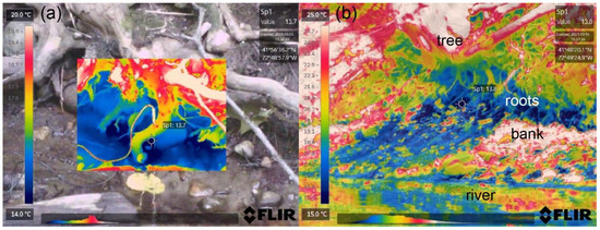 Preferential groundwater discharge directly associated with tree roots protruding from the bank along a (a) third-order, and (b) fifth-order stream section in the Farmington River watershed. The coldest discharge temperature at bank surface indicated by IR imaging within the field of view was similar at both sites at approximately 13.7 °C.
