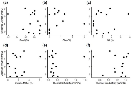 Dissolved oxygen measured in groundwater discharge compared to (a) % sand, (b) % clay, (c) % silt, (d) % organic matter, (e) thermal diffusivity, and (f) thermal conductivity measured in the local surficial soil sample for a subset of PDPs (n = 14) in the Farmington River study reach.