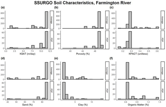 Soil parameters extracted from the SSURGO dataset at PDP locations and the average bank soil parameters from both banks of the Farmington River reach for (a) KSAT, (b) porosity, (c) hydraulic conductivity factor (KFACT), (d) sand %, (e) clay %, and (f) organic matter %.