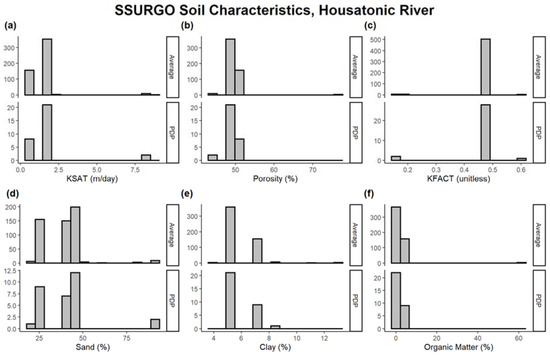Soil parameters extracted from the SSURGO dataset at PDP locations and the average bank soil parameters from both banks of the Housatonic River reach for (a) KSAT, (b) porosity, (c) hydraulic conductivity factor (KFACT), (d) sand %, (e) clay %, and (f) organic matter %.