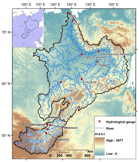 - Tananaev, N.; Makarieva, O.; Lebedeva, L. Trends in annual and extreme flows in the Lena River basin, Northern Eurasia. Geophys. Res. Lett. 2016, 43, 764–772. [Google Scholar] [CrossRef]