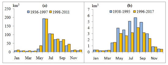 During the 20th and 21st centuries, the Lena River basin experienced some of the most intense changes in climate and river flow [13]. Since the early 21st century, the Lena River has been characterized by high-water availability [14]. Analyses of the annual Lena River runoff over the observation period, since 1936, at the outlet gauge Kusur, using the Mann–Kendall test, showed a statistically significant increase in flow at the 5% level after 1997. During the period 1936–1997, the mean annual runoff of the Lena River was 525 km3; during the period 1998–2011 (since 2012, discharge was not measured), it was 582 km3, i.e., 11% more (Figure 2). An analysis of the intra-annual flow distribution showed that the increase in the Lena River runoff could be explained by the 37% increase in the runoff from September to May (Figure 3). At the same time, the greatest increase in runoff was noted for May, September, and October. The magnitude of annual flow fluctuations was from 401 km3 in 1986 to 727 km3 in 1989.