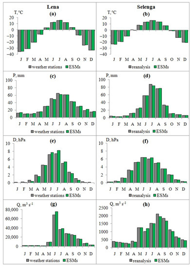 Normal monthly averaged-basin values of air temperature (a,b), precipitation (c,d), vapor pressure deficit (e,f), and runoff (g,h) of the Lena and Selenga Rivers, based on hydrological modeling, using the data of weather stations or reanalysis and the Historical Earth System Models (ESMs) dataset for the period 1970–1999 and 1981–2005, respectively.