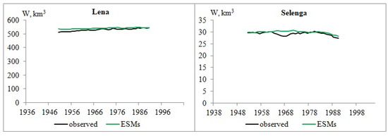 According to ESMs, the Lena River is characterized by an overestimation of runoff in June by 10%, relative to observational data (Figure 5). For the Selenga River, there was an overestimation of runoff in June by 16% and an underestimation from August to October by 10%. The calculations of the normal annual runoff using the ESMs data were more accurate. The PBIAS was 4% for the Lena and 5% for the Selenga.
