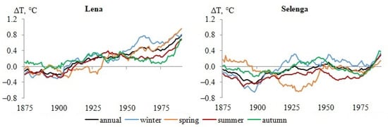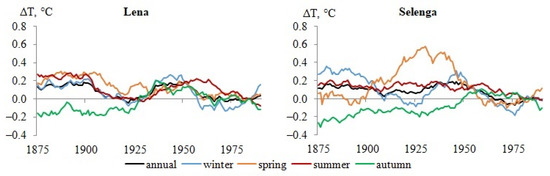 During the calculation period from 1861 to 2005, analyses of air temperature anomalies using the 30-year moving average for the Lena and Selenga basins showed that the mean annual air temperature decreased by 0.1 °C, and by 0.2 °C for some seasons under natural climate variability (Figure 7). The anthropogenic component of climate change was very pronounced in the increase in the mean annual air temperature in the Lena basin, by 1 °C during the 20th century, especially in winter and spring (Figure 8). Anthropogenic warming for the Selenga basin has been expressed in an increase in the mean annual temperature since the mid-1980s, by 0.3 °C, especially in the summer and autumn.