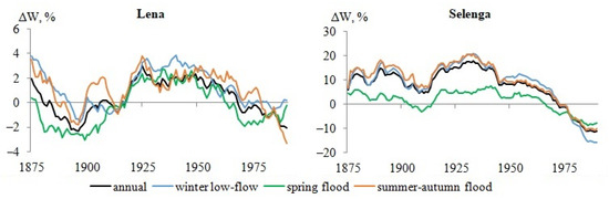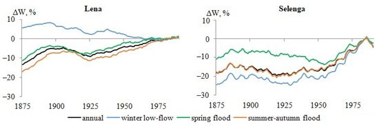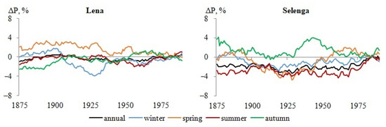 An analysis of precipitation anomalies for the Lena basin showed that annual precipitation almost did not change under natural variability. The trend of winter precipitation decreasing by 6% was noted in the first two decades of the 20th century as well as a monotonic increase in autumn precipitation by 5% during the calculation period (Figure 9). For the Selenga basin, there was a 3% increase in annual precipitation in the last two decades of the 20th century due to an increase in summer precipitation, which was about 70% of the annual total.