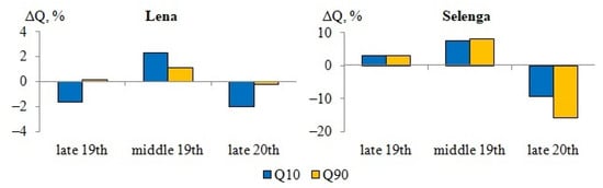 The anthropogenic component of climate change did not affect the changes in high (Q10) and low (Q90) flow of the Lena River; the variation did not exceed ±2%. The high and low flow of the Selenga River under the anthropogenic climate change impact tended to increase in the late 19th and middle 20th centuries, while in the late 20th century, the Q10 and Q90 decreased by 10% and 15%, respectively (Figure 15).