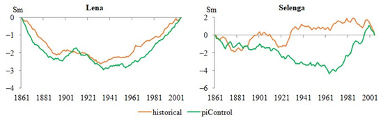 It should be noted that, variability since the 1970s, the runoff calculated under natural climates of both the Lena and Selenga prevailed over the runoff calculated using the Historical dataset. However, while both scenarios were positive for the Lena River, the natural Selenga runoff increased, and the runoff under the anthropogenic impact decreased. The reasons for the excess of the natural runoff of the Lena and Selenga over the runoff under anthropogenic greenhouse gas emissions were different. The slowdown in the Lena runoff increase calculated using the Historical dataset was explained by an increase in evaporation due to intense warming compared to the piControl dataset, while the decrease in the Selenga runoff relative to that calculated under natural climate variability was due to a decrease in precipitation.