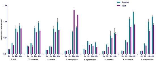 Effect of A. niger culture filtrate (ACF) on the growth of eight targeted enteric pathogens. The microtiter well plate with cultures (0.4 OD) treated with ACF at a ratio of 1:1 served as test and cultures without ACF were considered as control. Growth is marked as optical density (OD600 nm) measured after 0 h, 2 h, 24 h and 48 h of incubation. Values are the mean ± standard deviation of three replicates.