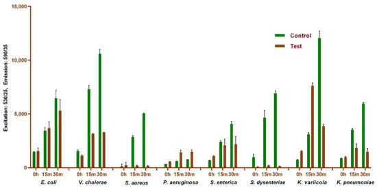 Effect of ACF on the viability of eight targeted micro-organisms by resazurin cell viability assay. The 96 well plate having cultures (0.4 OD) treated with ACF at a ratio of 1:1 served as a test. The cultures without ACF were considered as control. Both test and control were treated with resazurin (1 mmol) and the viability was measured at excitation and emission wavelength of 530/25, 590/35 respectively at an interval of 15 min. Values are means ± standard deviation of three replicates.