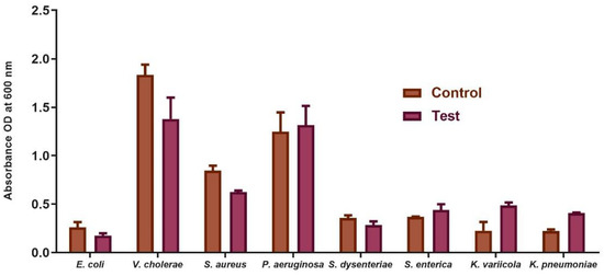 All the strains were characterized by their antibiogram to determine the antimicrobial resistance profile. Our results show that E. coli MDR was resistant to all the antibiotics, K. pneumoniae, and S. dysenteriae were resistant to 6 antibiotics, V. cholerae is resistant to five antibiotics, S. enterica and K. variicola were resistant to four antibiotics. This shows that all the bacterial strains used in the study were multidrug resistant strains except S. aureus, which was found to be resistant to only one antibiotic (Table 1).