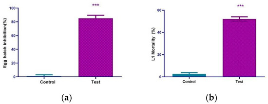 Treatment of eggs with ACF for 24 h showed 85% inhibition of egg hatching (Figure 4a) similarly, treatment of L1 larvae showed 52% mortality in L1 larvae as compared to the control after 24 h of treatment (Figure 4b). Significant reduction in hatching of eggsand mortality of L1 larvae (Figure 5) indicate that ACF also possesses nematicidal properties in addition to its antibacterial properties.