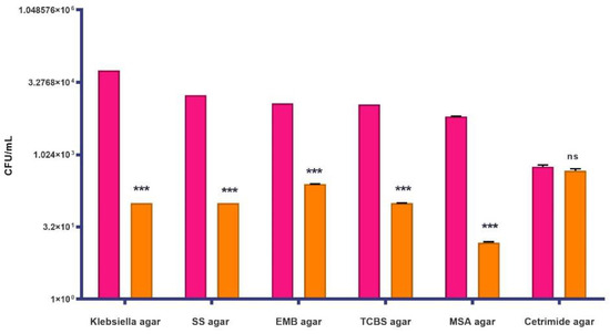 Effect of ACF on the reduction of enteric pathogens in wastewater. The raw wastewater treated with ACF in a 1:1 ratio served as test and the untreated wastewater served as control. The reduction of enteric pathogens was determined by CFU enumeration in selective and differential media (Klebsiella agar, SS agar- Salmonella Shigella agar, EMB agar- Eosin Methylene blue agar, TCBS –Thiosulfate citrate Bile Salts sucrose agar, MSA-Mannitol Salt agar) after 24 h of incubation. Values are means ± standard deviation of three replicates. Two-way ANOVA (analysis of variance) followed by Sidak’s multiple comparison test *** p < 0.001, ns- not significant.