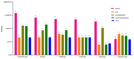 Effect of ACF on the reduction of presumptive pathogens in wastewater. The wastewater sample treated with ACF served as test and the untreated wastewater served as control. The ACF neutralized (N), heat-inactivated ACF(H) and ACF neutralized and heat-inactivated (N+H) were also used in the study. The reduction of presumptive pathogens was determined by CFU enumeration in selective and differential media (Klebsiella agar, SS agar- Salmonella Shigella agar, EMB agar- Eosin Methylene blue agar, TCBS –Thiosulfate citrate Bile Salts sucrose agar, MSA-Mannitol Salt agar and Cetrimide agar) after 24 h of incubation. Values are means ± standard deviation of three replicates. Different letters a, b and c indicate significant differences of treatment at p < 0.001 level (Bonferroni test) in their respective media.