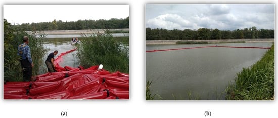 To determine the impact of the effective microorganisms on the water quality, a research area was separated using an anti-spill floating dam (FINBOOM) with dimensions of 50 m (length) × 15 m (width) × 2 m (height). Figure 1a shows assembly of the anti-spill floating dam and Figure 1b shows the designated research area. According to the information from the manufacturer (Lower Silesian Technology and Innovation Accelerator Ltd., Długołęka, Wrocław County, Poland), the EM biopreparation contained bacteria of the genus Lactobacillus, Bifidobacterium, Pediococcus, Lactococcus, Streptococcus (lactic acid bacteria), Rhodopseudomonas (photosynthetic bacteria), Aspergillus, Mucor (anaerobic fermenting fungi), and Streptomyces (actinomycetes). Biopreparation was used in the form of bokashi balls (SD ProBio Original) and applications on and below the water surface (ProBio Sanit). The preparation of bokashi balls consisted of mixing clay and bottom sediment with microbiological preparation with the addition of wheat bran. Subsequently, the balls weighing about 270 g were shaped and stored in a dry and warm place for 7 days. A total of 2000 bokashi balls were made per application (two balls per m2). The preparation of EM liquid involved making the stock solution concentration of the preparation by diluting it with water in a 1:10 ratio. The EM liquid preparation was spread with a sprayer on the water surface in the amount of 10 L per m2 and pumped 0.5 m below the surface in the amount of 10 L per m2. The application area was 750 m2 and the number of EM was in the range of 1.0·108–1.0·1010 CFUg−1 in both biopreparations. The application of the EM technology was conducted on 8 August 2021.